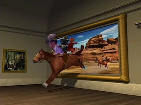 The painted horses are part of a painting in the art museum. At night, they spring to life and act similarly to giant Texan colts. They are able to jump out of their painting and roam the halls of the museum.