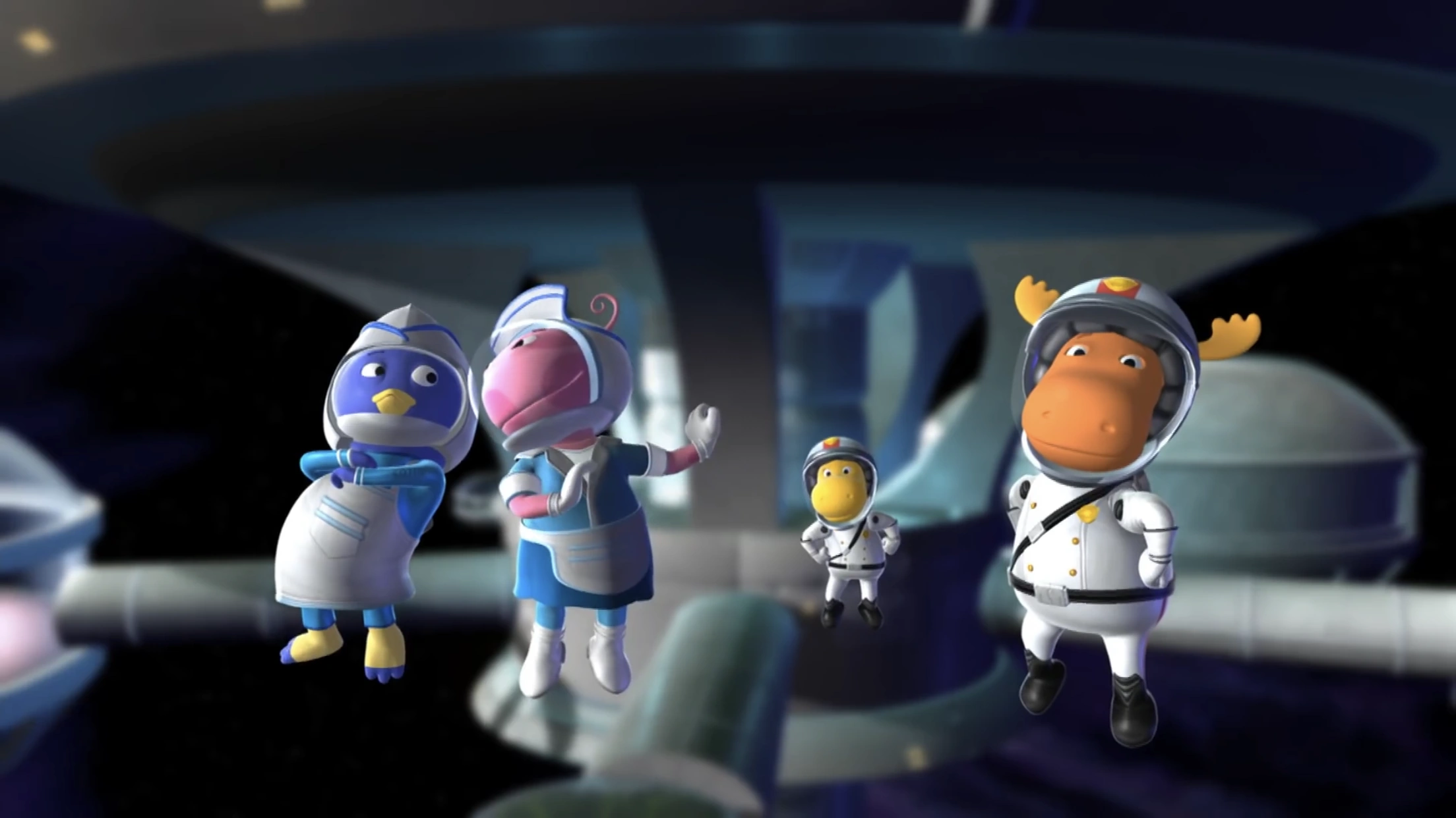 "Stop That Alien!" is a song from the episode "The Big Dipper Diner". Characters singingLyricsTyrone: We will catch that creature. There’s no way he’ll get away. He cannot escape us, ‘cause space crime doesn’t pay! Tasha: We must stop him shrinking long before he shrinks us all. He has made me angry, and also made me small. Tyrone and Tasha: We’ve got to stop that alien! Tyrone: He’s shrinking all our stuff! Tyrone and Tasha: Got to stop that alien! Tasha: We’ve really had enough! Tyrone and Tasha: We’ve got to stop that alien! Tyrone: Because he shrunk my friend! Tyrone and Tasha: We will stop that alien before he shrinks again! Uniqua: I wish Hugs would come back, ‘cause it’s dangerous out here. I hope we find her, and I hope the Blaarg’s not here. Pablo: If the Blaarg gets to her, then our Hugs is really sunk. So let’s chase her faster so we won’t see her shrunk! Uniqua and Pablo: We got to stop that alien! Uniqua: He’s shrinking all our stuff! Uniqua and Pablo: We got to stop that alien! Pablo: We’ve really had enough! Uniqua and Pablo: We got to stop that alien! Uniqua: ‘Cause Hugs is our good friend. Uniqua and Pablo: We will stop that alien before he shrinks again! (speaking) He shrunk again! Pablo: (speaking) The Blaarg is shrinking everything. Tasha: (speaking) We must stop him! All: We got to stop that alien! Uniqua and Pablo: He’s shrinking all our stuff! All: We got to stop that alien! Tyrone and Tasha: We’ve really had enough! All: We got to stop that alien! Although we don’t know when, we will stop that alien... before he shrinks again! Trivia